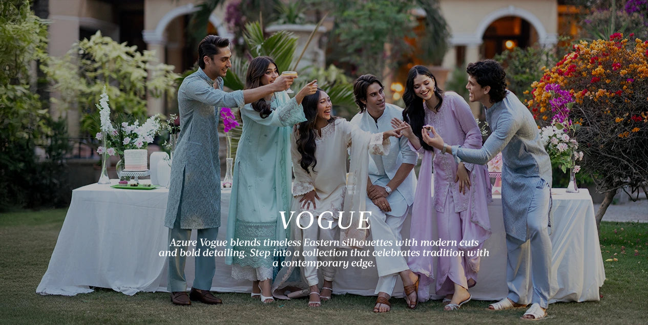 Why spend hours searching for tailors or stressing over fabric choices when ready to wear is right at your fingertips? The Azure Vogue collection is all about saving time while looking fabulous. Whether it's Eid brunches, dholkis, intimate dinners, or family celebrations, our ready-to-wear pieces are designed to meet the moment with grace and glamour. From the perfect stitch to stunning finishes, this is ready-to-wear fashion that understands your lifestyle—busy, social, and stylish. So, if you’re planning your festive wardrobe, go for pieces that are already perfected—go for ready-to-wear.