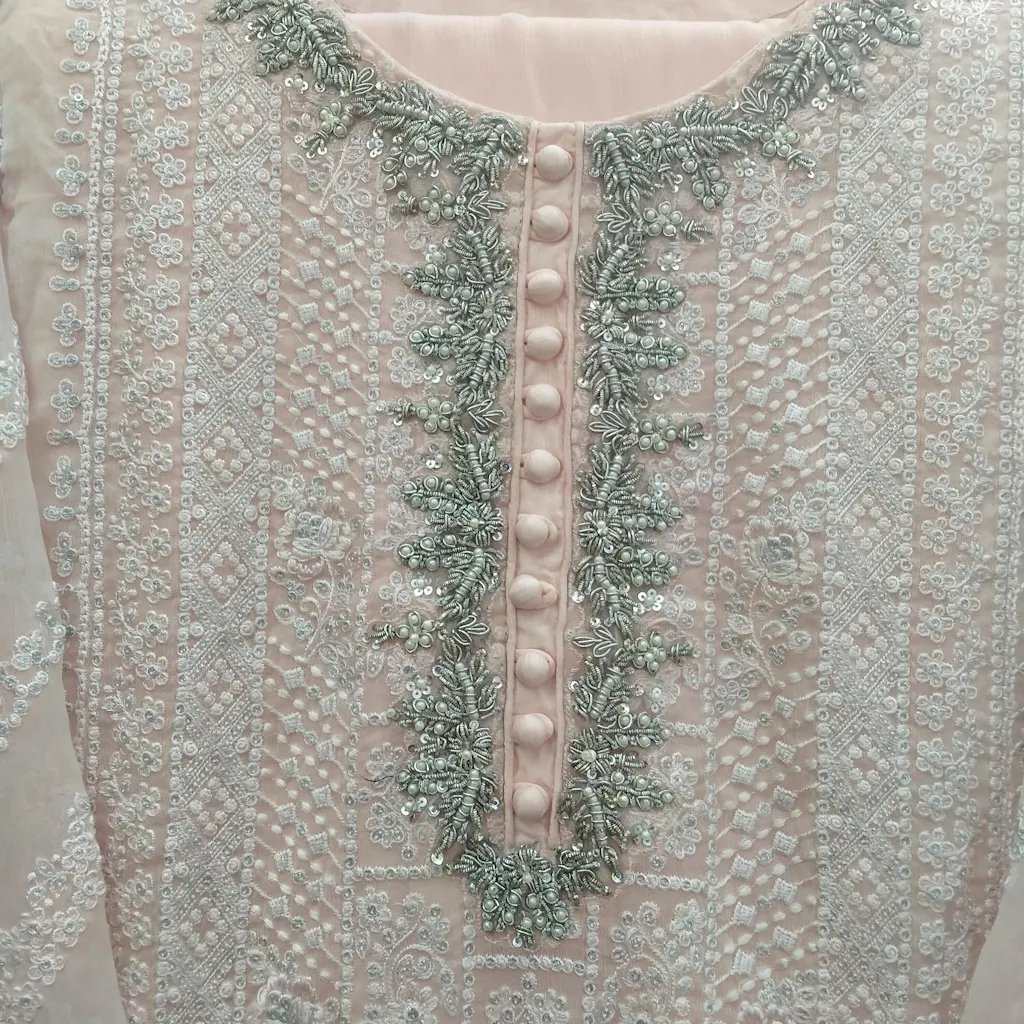 Presenting "Coral Haze" – a mesmerizing ensemble draped in the soft glow of buttery salmon pink. The sequin chiffon shirt dazzles with a hoop button neckline, bedecked with lavish hand-embellished details of kora, dabka, and sequins, reminiscent of sparkling sunlit waves. Sleeves and daman are adorned with an organza border delicately finished with lace. Paired harmoniously with raw silk bottoms, a sequin-embroidered chiffon dupatta adds a celestial shimmer, inviting you to immerse yourself in the ethereal beauty of "Coral Haze." Step into the realm of enchantment and let its allure transport you to a world of radiant splendor.