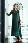 Emerald Whisper is a regal dark green chiffon ensemble, perfect for festive elegance. The delicately hand-embellished neckline adds a touch of luxury, while the flowing chiffon dupatta and tailored trousers complete the sophisticated look. This 3-piece outfit is an ideal choice for a graceful and timeless Eid ensemble.
